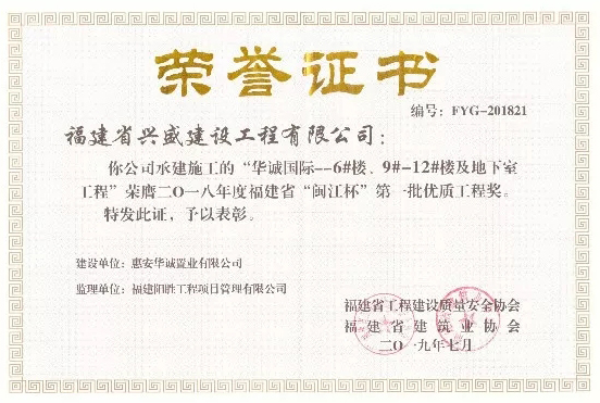 兴盛建工承建施工的华城国际荣获省优工程奖荣获2018年度第一批福建省“闽江杯”优质工程奖